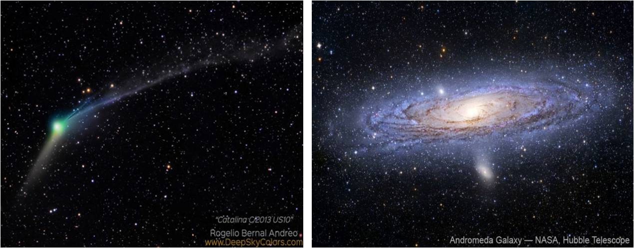 Figuras: Alguns dos objectos observados na Noite de Astronomia na Escola, à esquerda o cometa Catalina (C/2013 US10) e à direita a galáxia de Andrómeda (M31) e as suas galáxias satélites M32 e M110. Créditos das fotos: presentes nas mesmas.